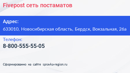 Fivepost, сеть постаматов по адресу 633010, Новосибирская область, Бердск, Вокзальная, 26а в дальнейшем Организация, размещена в следующих категориях: