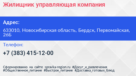 Жилищник, управляющая компания по адресу 633010, Новосибирская область, Бердск, Первомайская, 26Б в дальнейшем Организация, размещена в следующих категориях: