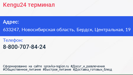 Kengu24, терминал по адресу 633247, Новосибирская область, Бердск, Центральная, 19 в дальнейшем Организация, размещена в следующих категориях: