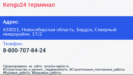 Kengu24, терминал по адресу 633011, Новосибирская область, Бердск, Северный микрорайон, 17/2 в дальнейшем Организация, размещена в следующих категориях: