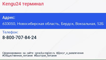 Kengu24, терминал по адресу 633010, Новосибирская область, Бердск, Вокзальная, 52Б в дальнейшем Организация, размещена в следующих категориях:
