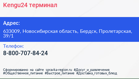 Kengu24, терминал по адресу 633009, Новосибирская область, Бердск, Пролетарская, 39/1 в дальнейшем Организация, размещена в следующих категориях: