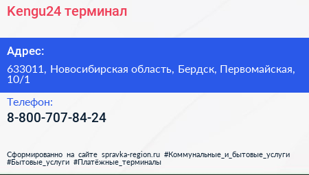 Kengu24, терминал по адресу 633011, Новосибирская область, Бердск, Первомайская, 10/1 в дальнейшем Организация, размещена в следующих категориях: