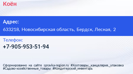 Коён по адресу 633218, Новосибирская область, Бердск, Лесная, 2 в дальнейшем Организация, размещена в следующих категориях: