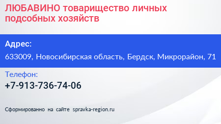 ЛЮБАВИНО, товарищество личных подсобных хозяйств по адресу 633009, Новосибирская область, Бердск, Микрорайон, 71 в дальнейшем Организация, размещена в следующих категориях:
