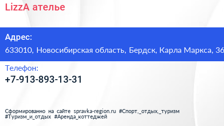 LizzA, ателье по адресу 633010, Новосибирская область, Бердск, Карла Маркса, 36 в дальнейшем Организация, размещена в следующих категориях:
