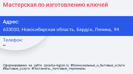 Мастерская по изготовлению ключей по адресу 633010, Новосибирская область, Бердск, Ленина, 94 в дальнейшем Организация, размещена в следующих категориях: