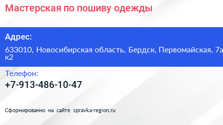 Мастерская по пошиву одежды по адресу 633010, Новосибирская область, Бердск, Первомайская, 7а к2 в дальнейшем Организация, размещена в следующих категориях: