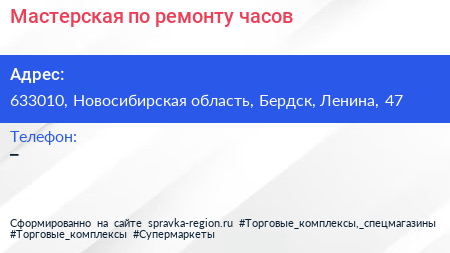 Мастерская по ремонту часов по адресу 633010, Новосибирская область, Бердск, Ленина, 47 в дальнейшем Организация, размещена в следующих категориях: