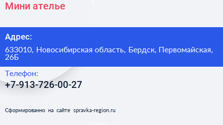 Мини-ателье по адресу 633010, Новосибирская область, Бердск, Первомайская, 26Б в дальнейшем Организация, размещена в следующих категориях: