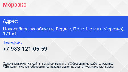 Морозко по адресу Новосибирская область, Бердск, Поле 1-е (снт Морозко), 171 к1 в дальнейшем Организация, размещена в следующих категориях: