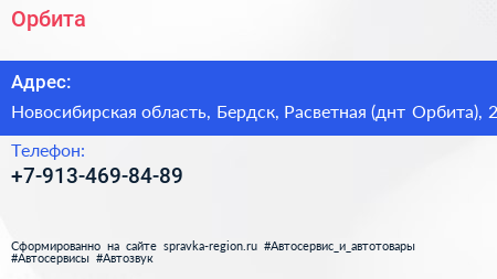 Орбита по адресу Новосибирская область, Бердск, Расветная (днт Орбита), 2 в дальнейшем Организация, размещена в следующих категориях: