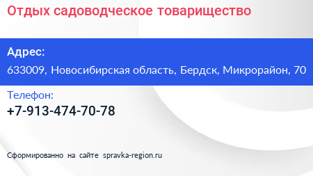 Отдых, садоводческое товарищество по адресу 633009, Новосибирская область, Бердск, Микрорайон, 70 в дальнейшем Организация, размещена в следующих категориях: