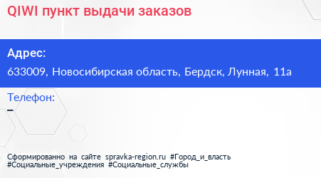 QIWI, пункт выдачи заказов по адресу 633009, Новосибирская область, Бердск, Лунная, 11а в дальнейшем Организация, размещена в следующих категориях: