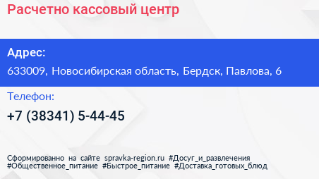 Расчетно-кассовый центр по адресу 633009, Новосибирская область, Бердск, Павлова, 6 в дальнейшем Организация, размещена в следующих категориях: