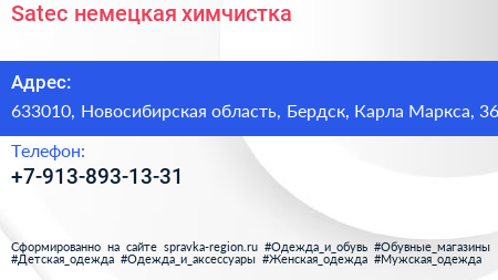 Satec, немецкая химчистка по адресу 633010, Новосибирская область, Бердск, Карла Маркса, 36 в дальнейшем Организация, размещена в следующих категориях:
