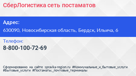 СберЛогистика, сеть постаматов по адресу 630090, Новосибирская область, Бердск, Ильича, 6 в дальнейшем Организация, размещена в следующих категориях: