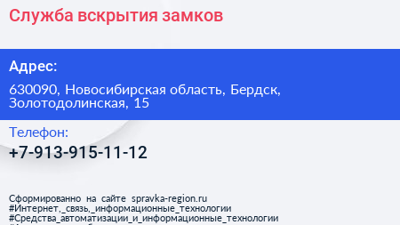 Служба вскрытия замков по адресу 630090, Новосибирская область, Бердск, Золотодолинская, 15 в дальнейшем Организация, размещена в следующих категориях: