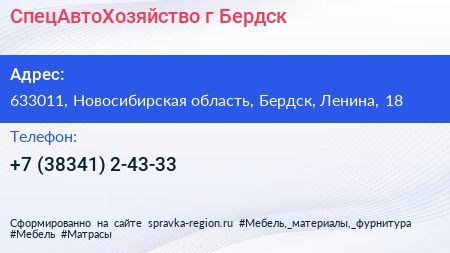 СпецАвтоХозяйство, г. Бердск по адресу 633011, Новосибирская область, Бердск, Ленина, 18 в дальнейшем Организация, размещена в следующих категориях: