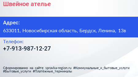 Швейное ателье по адресу 633011, Новосибирская область, Бердск, Ленина, 13в в дальнейшем Организация, размещена в следующих категориях: