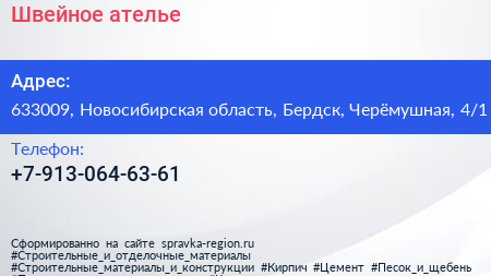 Швейное ателье по адресу 633009, Новосибирская область, Бердск, Черёмушная, 4/1 в дальнейшем Организация, размещена в следующих категориях: