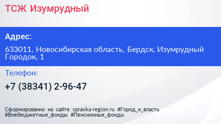 ТСЖ Изумрудный по адресу 633011, Новосибирская область, Бердск, Изумрудный Городок, 1 в дальнейшем Организация, размещена в следующих категориях: