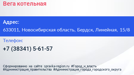 Вега, котельная по адресу 633011, Новосибирская область, Бердск, Линейная, 15/8 в дальнейшем Организация, размещена в следующих категориях: