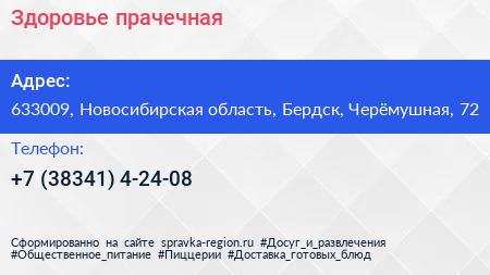 Здоровье, прачечная по адресу 633009, Новосибирская область, Бердск, Черёмушная, 72 в дальнейшем Организация, размещена в следующих категориях: