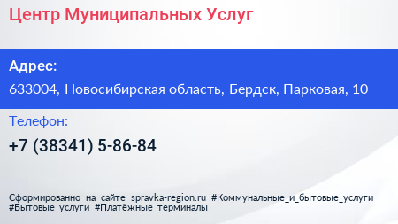 Центр Муниципальных Услуг по адресу 633004, Новосибирская область, Бердск, Парковая, 10 в дальнейшем Организация, размещена в следующих категориях: