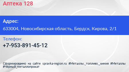 Аптека №128 по адресу 633004, Новосибирская область, Бердск, Кирова, 2/1 в дальнейшем Организация, размещена в следующих категориях: