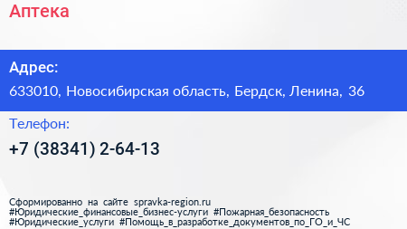 Аптека по адресу 633010, Новосибирская область, Бердск, Ленина, 36 в дальнейшем Организация, размещена в следующих категориях: