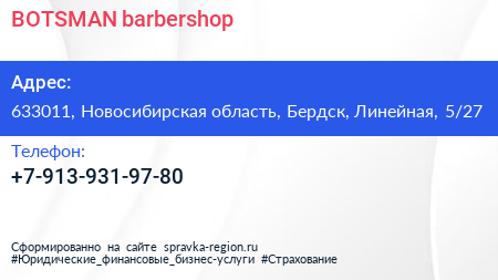 BOTSMAN barbershop по адресу 633011, Новосибирская область, Бердск, Линейная, 5/27 в дальнейшем Организация, размещена в следующих категориях: