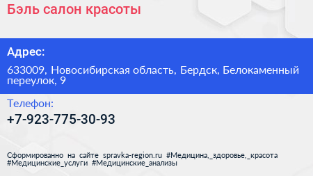 Бэль, салон красоты по адресу 633009, Новосибирская область, Бердск, Белокаменный переулок, 9 в дальнейшем Организация, размещена в следующих категориях: