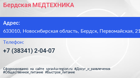 Бердская МЕДТЕХНИКА по адресу 633010, Новосибирская область, Бердск, Первомайская, 21 в дальнейшем Организация, размещена в следующих категориях:
