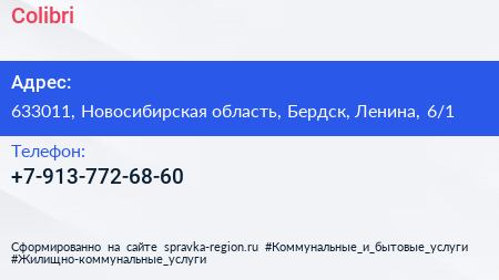 Colibri по адресу 633011, Новосибирская область, Бердск, Ленина, 6/1 в дальнейшем Организация, размещена в следующих категориях: