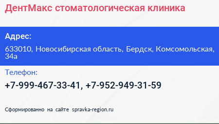 ДентМакс, стоматологическая клиника по адресу 633010, Новосибирская область, Бердск, Комсомольская, 34а в дальнейшем Организация, размещена в следующих категориях: