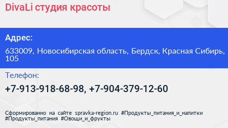 DivaLi, студия красоты по адресу 633009, Новосибирская область, Бердск, Красная Сибирь, 105 в дальнейшем Организация, размещена в следующих категориях:
