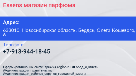 Essens, магазин парфюма по адресу 633010, Новосибирская область, Бердск, Олега Кошевого, 6 в дальнейшем Организация, размещена в следующих категориях:
