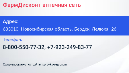 ФармДисконт, аптечная сеть по адресу 633010, Новосибирская область, Бердск, Лелюха, 26 в дальнейшем Организация, размещена в следующих категориях:
