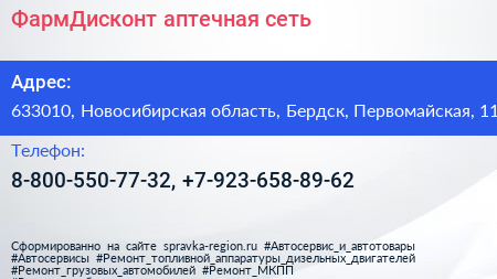 ФармДисконт, аптечная сеть по адресу 633010, Новосибирская область, Бердск, Первомайская, 11 в дальнейшем Организация, размещена в следующих категориях: