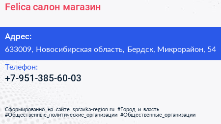 Felica, салон-магазин по адресу 633009, Новосибирская область, Бердск, Микрорайон, 54 в дальнейшем Организация, размещена в следующих категориях: