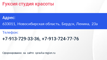 Fуксия, студия красоты по адресу 633011, Новосибирская область, Бердск, Ленина, 23а в дальнейшем Организация, размещена в следующих категориях: