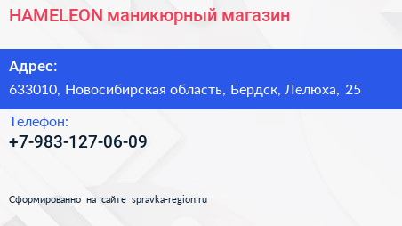 HAMELEON, маникюрный магазин по адресу 633010, Новосибирская область, Бердск, Лелюха, 25 в дальнейшем Организация, размещена в следующих категориях: