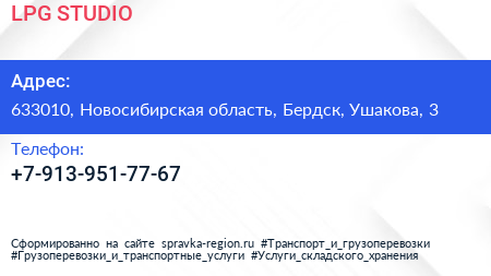 LPG-STUDIO по адресу 633010, Новосибирская область, Бердск, Ушакова, 3 в дальнейшем Организация, размещена в следующих категориях: