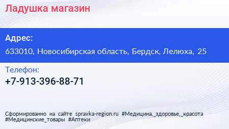 Ладушка, магазин по адресу 633010, Новосибирская область, Бердск, Лелюха, 25 в дальнейшем Организация, размещена в следующих категориях: