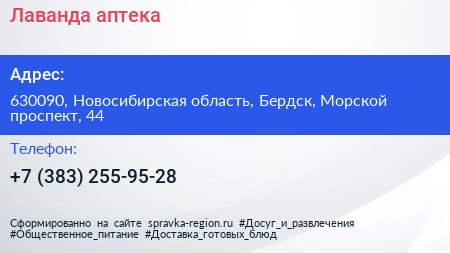 Лаванда, аптека по адресу 630090, Новосибирская область, Бердск, Морской проспект, 44 в дальнейшем Организация, размещена в следующих категориях:
