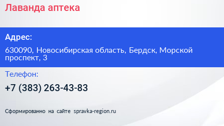 Лаванда, аптека по адресу 630090, Новосибирская область, Бердск, Морской проспект, 3 в дальнейшем Организация, размещена в следующих категориях: