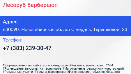 Лесоруб, барбершоп по адресу 630090, Новосибирская область, Бердск, Терешковой, 33 в дальнейшем Организация, размещена в следующих категориях: