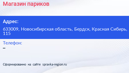 Магазин париков по адресу 633009, Новосибирская область, Бердск, Красная Сибирь, 115 в дальнейшем Организация, размещена в следующих категориях: