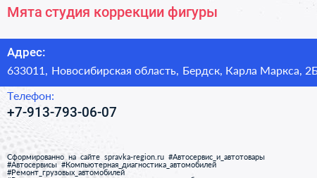 Мята, студия коррекции фигуры по адресу 633011, Новосибирская область, Бердск, Карла Маркса, 2Б в дальнейшем Организация, размещена в следующих категориях: